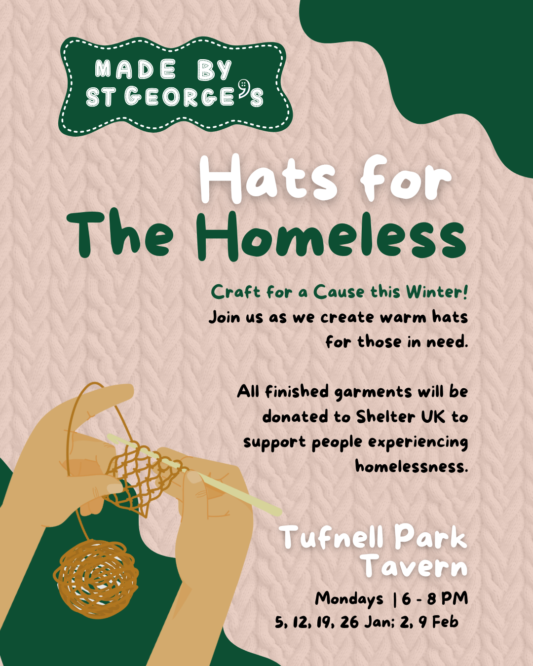 Every Monday evening in January and early February, we’ll gather at Tufnell Park Tavern to knit warm hats for people experiencing homelessness. Each hat will be donated to Shelter UK, helping bring comfort and hope during these cold months.