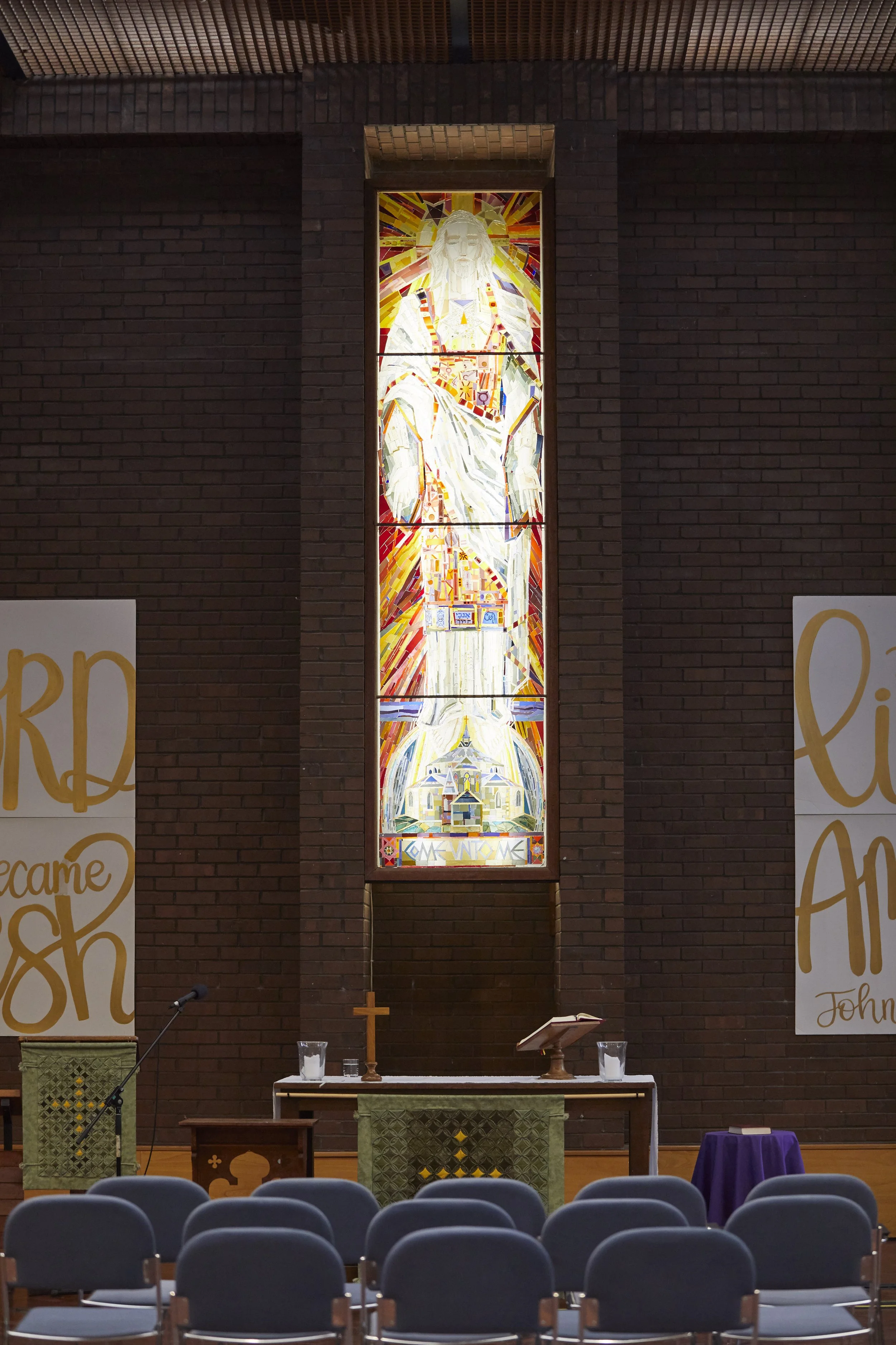 One of the church’s most striking features is the icon of Christ as High Priest on the East wall, created by artist Doritie Kettlewell (1916–2014). Made from thin sheets of coloured glass, the icon includes inscriptions in: